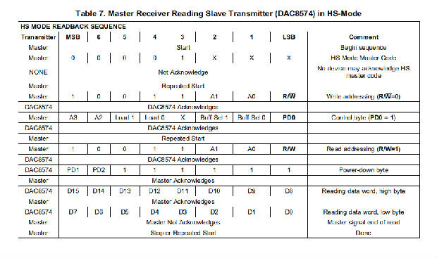 在(PD0位=1)下,DAC8574传输3字节数据,断电字节后是高字节,然后是低字节(参考表7 HS模式读回序列)。