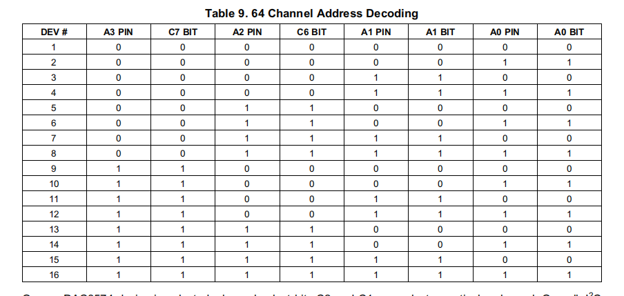 四个地址引脚应在通电时设置,地址位必须设置为与特定设备的地址引脚相匹配。要解码多达16个DAC8574设备,A3、A2、A1、A0地址引脚和C7、C6、A1、A0地址位的逻辑状态应如表9所示进行设置。