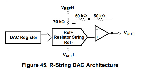 DAC8574的体系结构由一个字符串DAC和一个输出缓冲放大器组成。图45显示了DAC体系结构的通用框图。