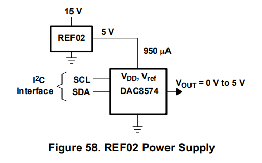 如果使用REF02,则需要向DAC8574提供的电流为950μA(典型值),VDD=5 V时的最大值为1600μA。加载DAC输出时,REF02还需要向负载提供电流。所需的总典型电流(单个DAC输出上有5 kΩ负载)为:950 μA + (5 V / 5 kΩ) = 1.950 mA