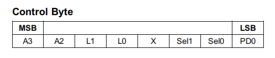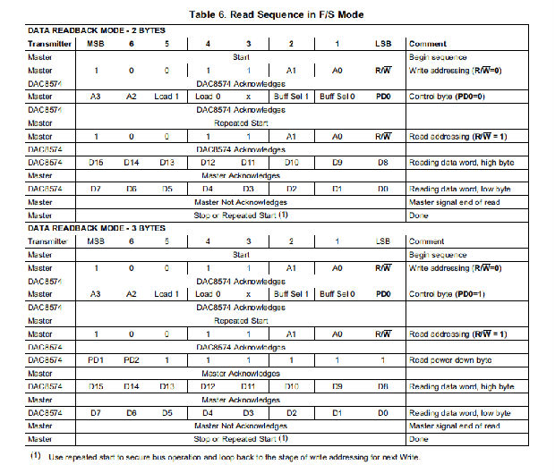 然后,有一个由主机启动的重复启动条件,地址以(R/W=1)重新发送。这由DAC8574确认,表示它准备好传输数据。然后根据(PD0位),从DAC8574读回两个或三个字节的数据。Buff-Sel1和Buff-Sel0的值决定读回哪个通道数据。随后出现停止条件。