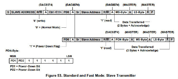 图53显示了标准和快速模式主发送器,该主发送器使用7位地址寻址DAC8574从发送器。