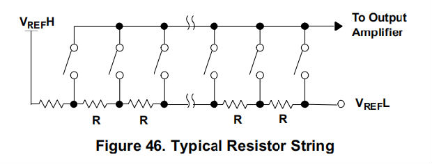 图46所示为电阻器组。它基本上是一个除以2的电阻器,后面是一个电阻串,每个电阻值为R。加载到DAC寄存器中的代码通过关闭将串连接到放大器的开关之一来确定在串上的哪个节点上电压被分接以馈入输出放大器。由于该体系结构由一串电阻组成,所以它被指定为单调的。