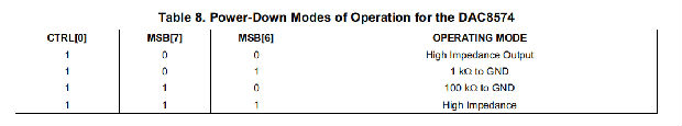 在(PD0位=1)下,DAC8574期望接收2字节的断电数据(请参阅表4的断电模式部分)。