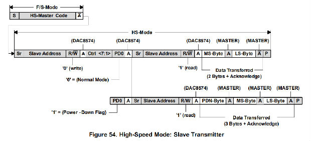 图54显示了高速模式下I2C主机寻址DAC8574(具有7位地址),作为从机发射机。
