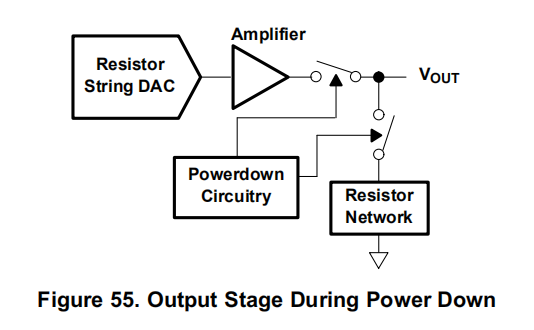 当(CTRL[0]=PD0=0)时,设备正常工作,每通道5V时,其正常功耗为250μA。然而,对于三种断电模式,电源电流在5V时降至200NA(3V时为50NA)。不仅电源电流下降,而且输出级也在内部从放大器的输出切换到已知值的电阻网络。这有一个优点,即在断电模式下,设备的输出阻抗是已知的。有三种不同的选择:输出通过1 kΩ电阻器、100 kΩ电阻器内部连接到GND或左开路(高阻抗)。输出级如图55所示。
