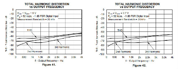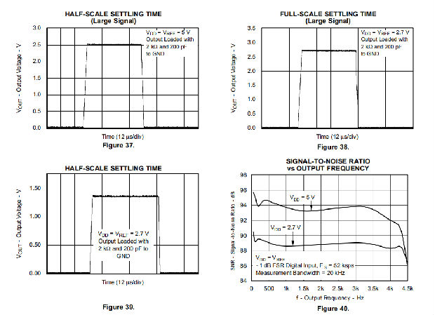 DAC8574体系结构为每个DAC通道使用单独的电阻串,以实现超低串扰性能。在相邻信道满标度变化期间,在一个信道上看到的直流串扰通常小于0.5 LSBs。测量到的交流串扰(对于全刻度,在一个信道上产生的1khz正弦波输出,在剩余的输出信道上测量)通常低于-100db。此外,DAC8574可实现96 dB信噪比(SNR)和65 dB总谐波失真(THD)的典型交流性能,使DAC8574成为在4 kHz或以下输出频率下要求高信噪比的应用的可靠选择。