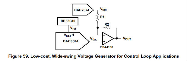 对于±10-V操作:R1=10 kΩ,R2=39 kΩ,Vtail=2.56 V,Vref=4.096 V