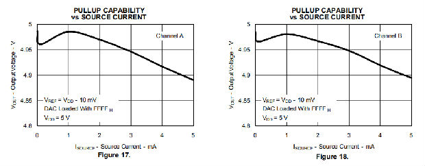 DAC8574输出级能够驱动高达1000 pF的负载,同时保持稳定。在偏移和增益误差范围内,当驱动电容性负载时,DAC8574可以运行轨对轨。2 kΩ的电阻负载可由DAC8574驱动,同时实现非常好的负载调节。当输出电压接近每根轨道时,负载调节误差增大。当DAC的输出在电阻负载下被驱动到正轨时,每个AB类输出级的PMOS晶体管都可以进入线性区。当这种情况发生时,增加的红外电压降会恶化DAC的线性性能。这只会在DAC的数字输入到电压输出传输特性的前20毫伏范围内发生。如果在满量程(在电阻负载条件下)要求良好的线性度,则施加在DAC8574上的参考电压可降低到施加到VDD的电源电压以下,以消除这种情况。