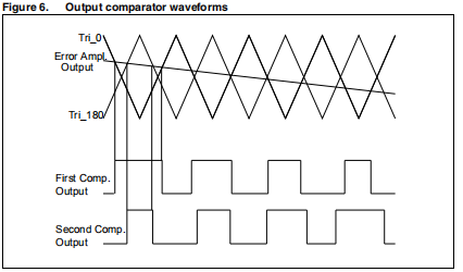 功率放大器不是线性放大器,而是在PWM模式下驱动输出的电路全桥配置阶段。输出占空比变化通过比较误差电压得到放大器和两个三角波参考Tri-0和Tri-U180。因为所有的电流控制回路是参考Vr参考,结果是当输出电压误差放大器等于Vr电压,两个输出输出端A和输出端B具有相同的电压相位和占空比为50%;将误差放大器的输出电压提高到Vr电压下,Out U A的占空比增加,Out U B的占空比减小相同的百分比;相反地,将误差放大器的电压降低到Vr电压、Out廑U A的占空比降低,Out廑B的占空比降低同样百分比的增长。
