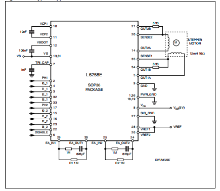 由于电路采用开关模式电流调节,以降低接线电感的影响一个好的电容器(100nF)可以放在板附近电源线(针脚13、31)和电源接地(针脚)之间的包装1,36,18,19)吸收少量的感应能量。需要注意的是,除了电解液外,通常还需要这种电容器在高频下性能较差的电容器,通常位于组件,在电源电压(针脚13、31)和电源接地(针脚1、36、18、19)之间在快速电流衰减或相位期间有电流再循环路径改变。该电容器的量程值在几μF到100μF之间,必须选择取决于电机电感和负载电流幅值等应用参数。在逻辑电源和接地之间还建议使用100nF的去耦电容器。EA_IN1和EA_IN2引脚执行高阻抗线路,必须注意避免信号上的耦合噪声。建议将组件连接到这个引脚靠近L6258E,用地面轨道包围它们,并尽可能远地保持设备可能的快速切换输出。还记得在在电源启动/关闭期间,避免输出电流峰值。无感电阻是实现传感的最佳方式。不管这是不是有可能,一些相同值的金属膜电阻器可以并联。用于感应绕组电机电流的两个输入端(感应A和感应B)应直接连接到感测电阻器Rs端子上,并在Rs和两个感应输入应尽可能短。
