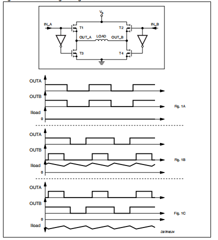 该电路用于驱动双极步进电机或两个直流电机的两个绕组。电流控制通过开关模式调节产生。在这个系统中,负载电流的方向和振幅取决于电流控制回路的两个输出之间的相位和占空比关系。L6258E功率级是由桥配置的动力DMO组成的如图4所示,其中桥输出OUT_A和OUT_B通过输入端的高电平输入端和输入端的高电平被驱动至接地端,而相同的输入。零电流条件是通过利用μA和中的信号驱动两个半桥得到的在同相位,占空比为50%的情况下。在这种情况下,两个半桥的输出在电源之间连续切换电源(Vs)和接地,但保持负载之间的压差等于零。图4显示了这两个输出的时序图和负载电流工作条件。