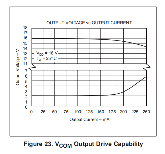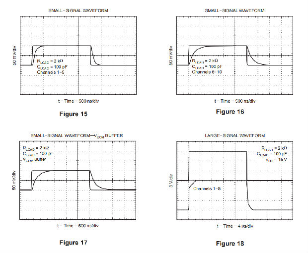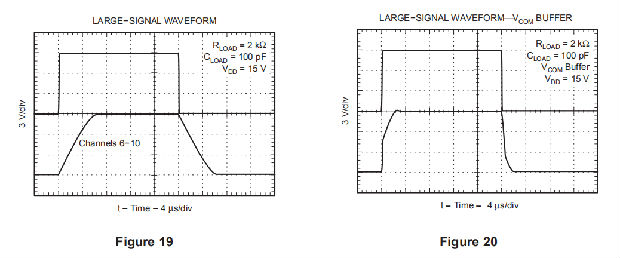 BUF11705的公共缓冲器输出比gamma缓冲器具有更大的输出驱动能力,以满足驱动LCD面板公共节点的更大电流需求。公共缓冲输出也被设计用来驱动更重的电容性负载。如图23所示,在高电流(>100毫安)下,可以实现出色的输出摆动。