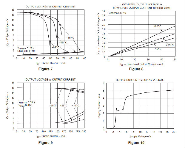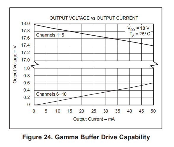 输出级的设计与输入级的特性相匹配。这意味着缓冲器1到5的输出级摆幅非常接近VDD(通常,10 mA时为VCC−100 mV)。缓冲器1到5摆动到GND的能力是有限的。缓冲器6到10的摆动比VDD更接近GND。缓冲器6到10设计成非常接近GND;通常,在10 mA负载电流下,GND+100 mV。有关更多详细信息,请参见典型特征。这种方法大大减少了整个解决方案的硅面积和总成本。但是,由于这个原因架构中,正确的缓冲器必须连接到正确的伽马校正电压上。将缓冲器1连接至最接近VDD的伽马电压,并将缓冲器2至5连接至顺序电压。缓冲器10应连接至最接近GND(或负轨)的伽马校正电压,缓冲器9至6应连接至顺序较高的电压。
