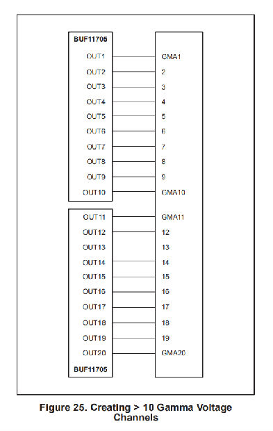 当需要更多的伽马校正通道时,可以并行使用两个或更多个BUF11705设备,如图25所示。这种能力提供了一种经济高效的方法,通过使用四通道运算放大器或缓冲器来创建更多的参考电压。图25中建议的配置简化了布局。各种不同的频道版本提供了高度的灵活性,同时也最小化了总成本和空间。