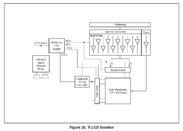 除了BUF11705系列伽马校正缓冲器外,TI还为LCD面板市场提供一整套集成电路,包括各种电源解决方案和音频电源解决方案。图26显示了TI的总IC溶液。