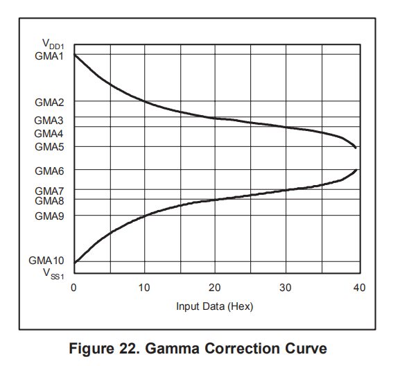 图22显示了具有10个伽马校正参考点(GMA1到GMA10)的典型伽马校正曲线。从这条曲线可以看出,每个缓冲器的电压要求差别很大。各种缓冲器的输入级的摆动能力与应用程序仔细匹配。缓冲器1到5有包括VDD的输入级,但只在1V到GND范围内摆动。缓冲区1到5只有一个NMOS输入级。缓冲区6到10只有一个PMOS输入级。PMOS输入级的输入范围包括GND。