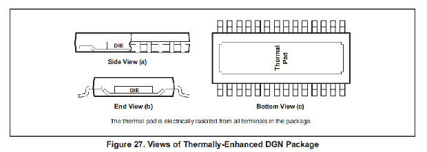BUF11705在热增强型PowerPAD包中提供。这个包装是用一个下装引线框架构造的,模具安装在上面,如图27(a)和(b)所示。这种布置导致引线框架暴露在封装底部的热垫上;见图27(c)。由于这种热垫与模具有直接的热接触,所以通过提供远离热的良好热路径,可以获得优异的热性能衬垫。