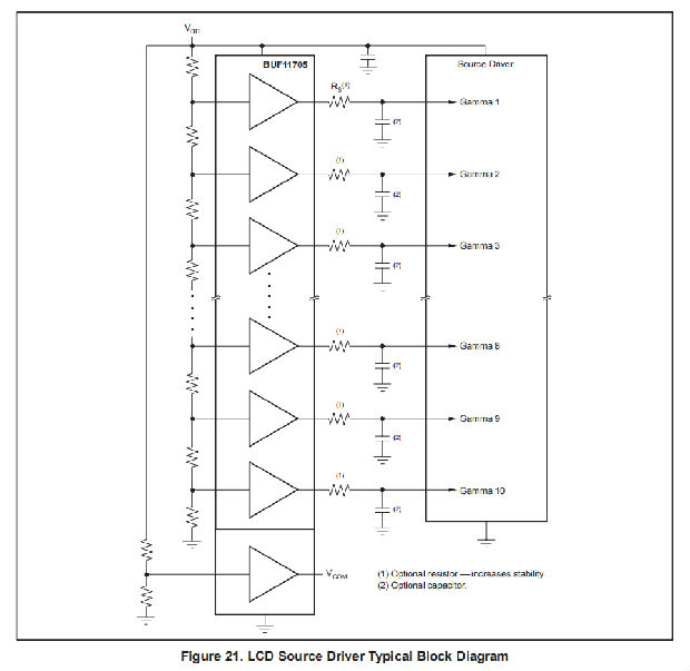 伽马校正电压通常使用一个简单的电阻梯架产生,如图21所示。BUF11705缓冲伽马校正电阻梯架上的各个节点。BUF11705的低输出阻抗迫使外部伽马校正电压施加在LCD源驱动器的相应参考节点上。图21显示了一个典型方框图中的BUF11705驱动LCD源驱动器和10通道伽马校正参考输入的示例。