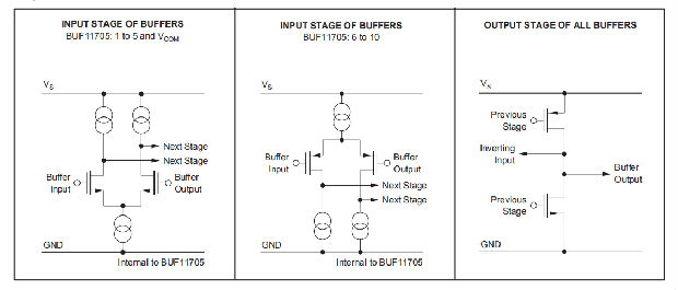 BUF11705提供10个伽马通道。为了节省更多的空间和成本,BUF11705集成了一个容量大于100 mA的VCOM通道。