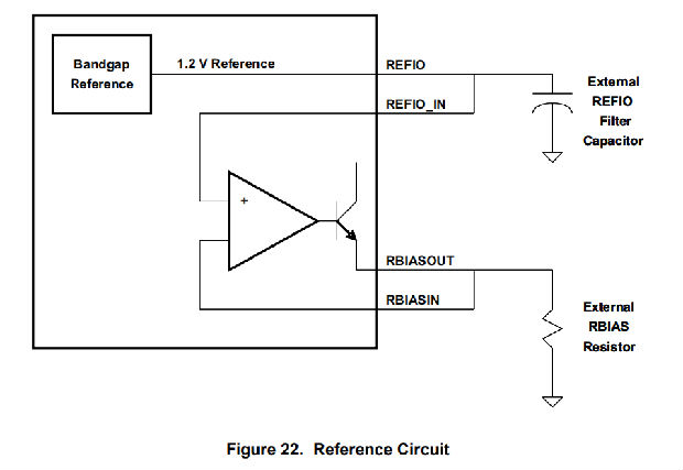 带隙参考电压提供1.2V的精确电压。设计者应将0.1μF的外部REFIO滤波器电容器连接到REFIO和REFIO_-IN引脚上进行补偿。