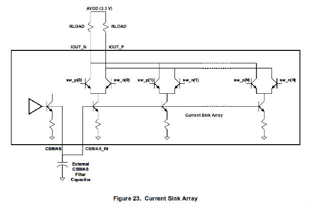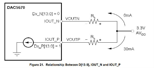 电流为全标度输出(5毫安)。因为输出级是一个电流汇,电流只能从AVDD通过负载电阻RL流入IOUT峎N和IOUT_P引脚。