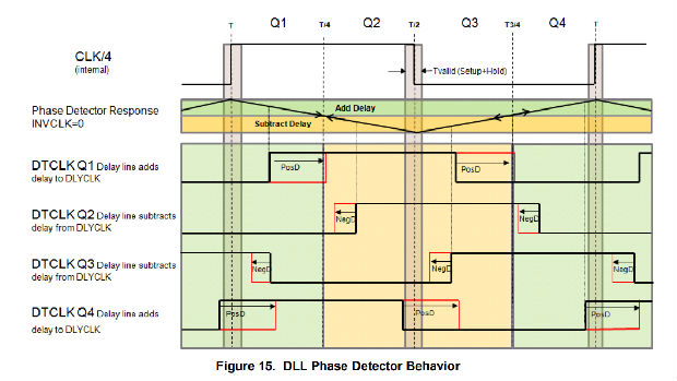 图15显示了相位检测器和延迟线相对于DTCLK上升沿的初始位置的行为。有四个不同的象限来定义行为。每个象限表示DDR时钟速率(2.4-GSPS情况下为600 MHz)除以4的周期。理想位置在象限1中具有DTCLK(因此数据位)的初始延迟。动态链接库的稳定锁定点在T/4,介于Q1和Q2之间。如果DTCLK的初始延迟在象限3或4,则可以断言INV_ckpin以提高DLL获得正交的能力。这个断言将稳定的求积点移到3T/4vs T/4的中心,如图15所示。本质上,增加延迟的区域变成减去延迟的区域,反之亦然。CLK/4的时钟相位也会反转。