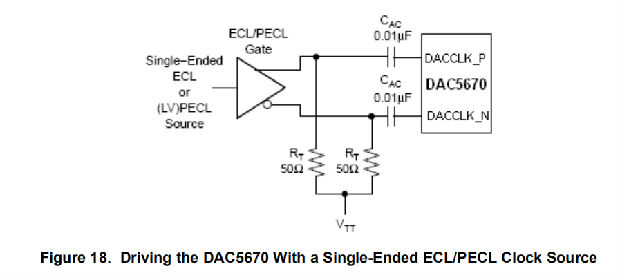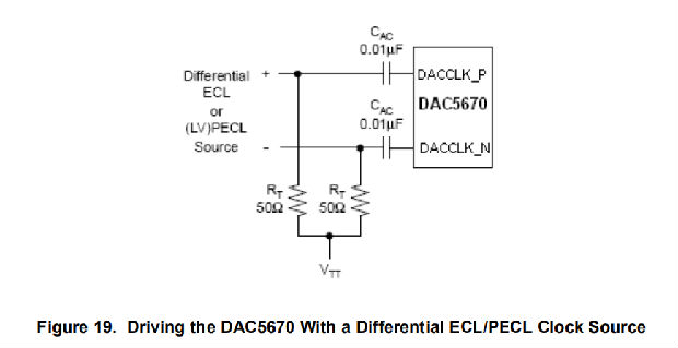 为了获得最佳的交流性能DAC5670,用差动LVPECL或正弦波源驱动时钟输入,如图18和图19所示。在这里,电压互感器的电位应设置为驱动器所需的端接电压以及适当的端接电阻(RT)。DAC5670时钟输入也可以使用TTL/CMOS电平进行单端驱动,以获得较低的时钟速率(参见图20)。