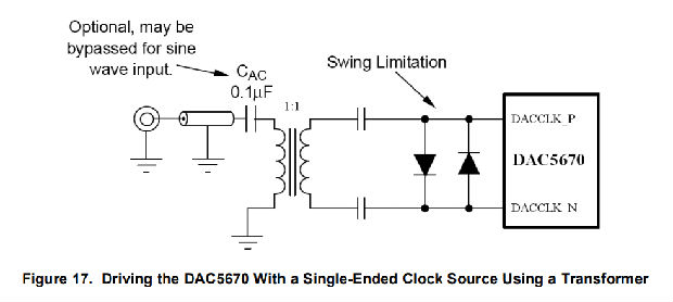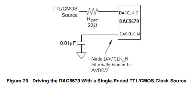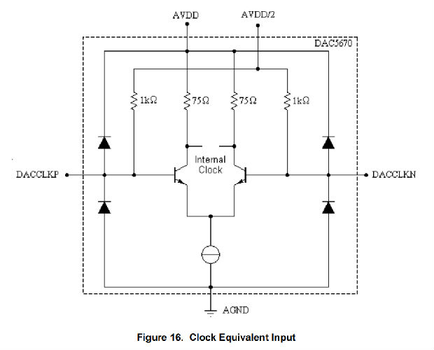 DAC5670具有与LVPECL兼容的差分时钟输入(DACCLKΜP、DACCLK_N)。图16显示了时钟输入缓冲器的等效示意图。内部偏置电阻将输入共模电压设置为AVDD/2,而输入电阻通常为1kΩ。各种时钟源可以与设备耦合,包括正弦波源(见图17)。