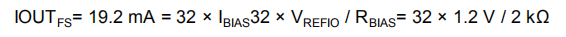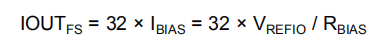 DAC5670包括用于偏置满标度输出电流的带隙基准和控制放大器。满标度输出电流通过在引脚RBIASOUT和RBIASIN上施加一个外部电阻器RBIAS来设置。偏置电流IBIAS,通过电阻RBIAS,由片上带隙基准电压和控制放大器定义。满标度输出电流等于该偏置电流的32倍。因此,满标度输出电流IOUTF可表示为: