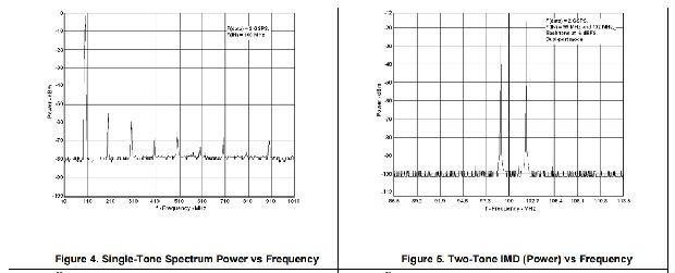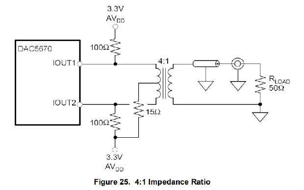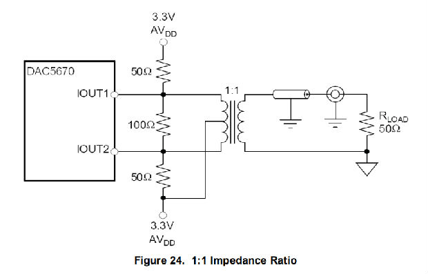 DAC5670可以很容易地配置为使用正确选择的变压器驱动双端接50Ω电缆。图24和图25分别显示了1:1和4:1阻抗比配置。这些配置提供对共模噪声源和偶数阶失真分量的最大抑制,从而使DAC的输出功率加倍。变压器一次侧的中心抽头端接至AVDD,使IOUT帴N和IOUT帴P都能获得直流电流。