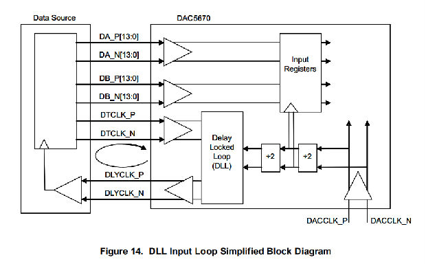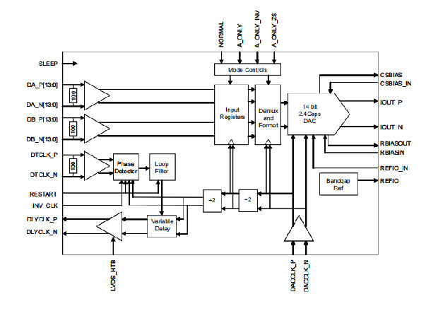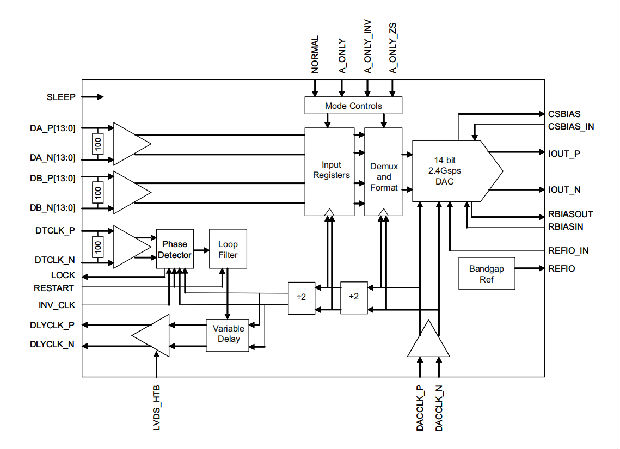 DAC5670是一个14位的DAC,最大输入速率为2.4 GSPS。DAC5670也适合在较低的采样率下工作,而无需使用DLL进行输入接口计时。