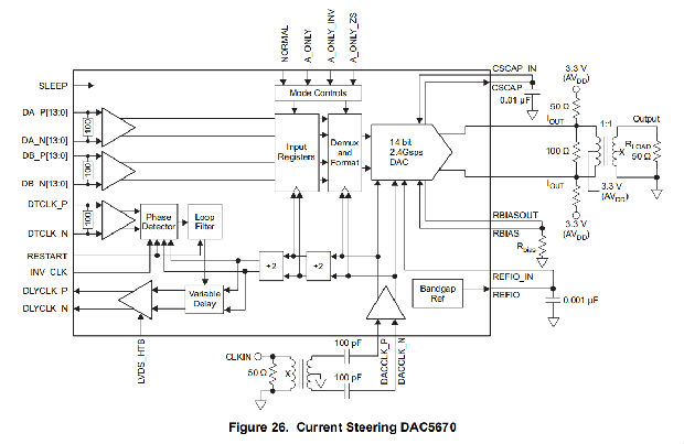 DAC5670差分数字输入与LVDS和超级传输电压电平兼容。