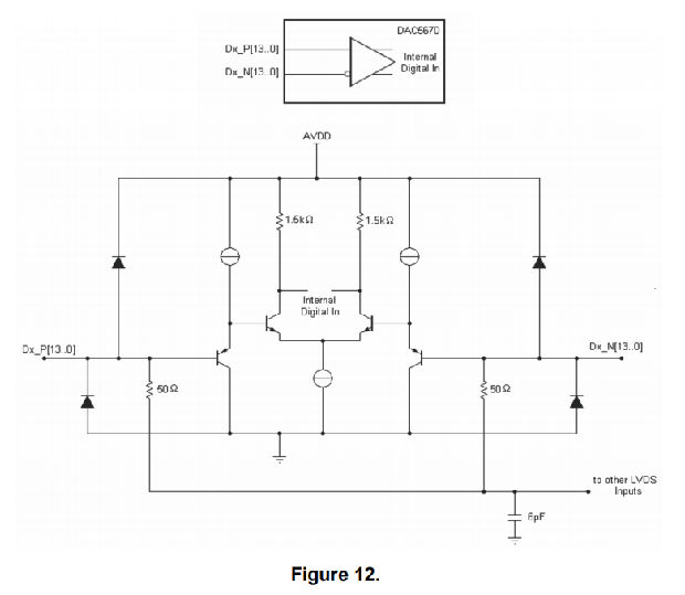 DAC5670使用低压差分信号(LVDS和超级传输)作为总线输入接口。LVDS和HyperTransport输入模式具有低差分电压摆幅的特点。LVDS和超级传输模式的差异特性允许在低电磁干扰(EMI)水平下进行高速数据传输。图12显示了DAC5670的等效互补数字输入接口,适用于引脚DA_P[13:0]、DA_N[13:0]、DB_P[13:0]和DB_N[13:0]。