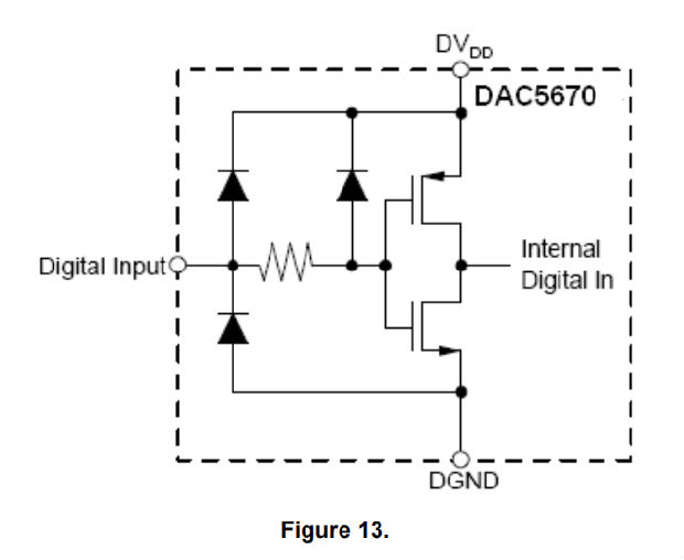 图13显示了DAC5670的等效CMOS/TTL兼容数字输入的示意图,适用于以下引脚:RESTART、LVDS_HTB、INV_CLK、SLEEP、NORMAL、a_ONLY、a_ONLY_INV和a_ONLY_ZS。