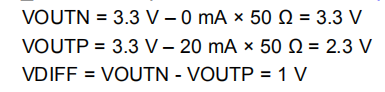 例如,假设D[13:0]=1且RL为50Ω,则引脚IOUT_N和IOUT_P之间的差分电压可以表示为等式6到方程8,其中IO(FS)=20 mA。
