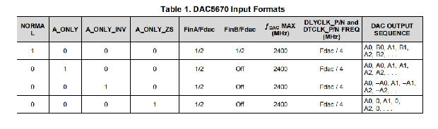 DAC5670有四种由四个互斥配置引脚选择的输入模式:正常、仅A U、A U ONLY U INV和A U ONLY U ZS。表1列出了每个配置的输入模式、输入采样率、最大DAC采样率(CLK输入)和产生的DAC输出序列。对于所有配置,DLYCLK_P/N输出和DTCLK_P/N输入都是dacclu P/N频率除以4。