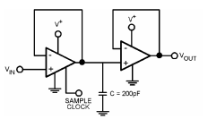 低输入偏置电流的LMV341导致高输入阻抗。当设备处于停机模式时,输出阻抗相当高。这些高的阻抗,以及关断销的能力从一个独立的电源,使LMV341成为一个好的采样和保持电路的选择。样品钟应该快速连接到放大器的关机引脚打开或关闭设备。图2显示了一个简单的sample-and-hold的示意图电路。当采样时钟很高时,第一个放大器在正常工作模式,第二个放大器作为缓冲区。电容器,在第一个放大器,此时正在充电。通过电容器是第一个放大器的非逆变输入因为它是作为电压跟随器连接的。当样品时钟低第一个放大器被关闭,带来输出阻抗高值。这个输出的高阻抗,以及第二个输入端的高阻抗放大器,防止电容器放电。有当第一个放大器处于关闭状态时,电压降很小模式。第二个放大器,它仍然正常工作模式和作为电压跟随器连接,也提供电容器输出端采样的电压。