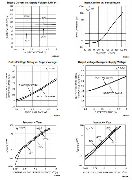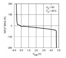 LMV341/LMV342/LMV344放大器有一个PMO在输出阶段。因此,它们的输入偏差要低得多电流大于BJT输入级的设备。此功能使这些设备成为传感器电路的理想选择。典型曲线LMV341的输入偏置电流如图7所示。