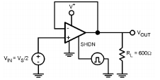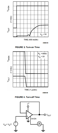 LMV341能够关闭,以便在便携式设备中提供电源和延长电池寿命。一旦处于关机模式,电源电流将大幅降低,最大值为1μA,输出将为“三态”当关机引脚电压为拉低了。关机引脚不得断开连接。保持引脚浮动将导致未定义的操作模式,设备可能在关机之间振荡和激活模式。LMV341通常在停机电压拉高后开启2.8μs。之后,设备将在不到400 ns的时间内关闭关闭电压拉低。图3和图4显示LMV341的开启时间和关闭时间。在为了减少电容的影响电路由示波器探头,在关断时间电路中有一个电阻增加600Ω的负载。图5和图6显示了测试用于获得两个曲线图的电路。