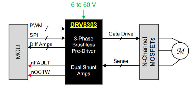 DRV8303是一种用于三相电机驱动应用的门驱动器IC。它提供三个半桥驱动器,每一个都能驱动两个N沟道mosfet。它支持高达1.7A电源和2.3A峰值电流能力。DRV8303可以在6-V到60-V的大范围单电源供电的情况下工作。它使用带涓流充电电路的自举门驱动器架构,以支持100%的占空比。DRV8303在高侧或低侧MOSFET切换时使用自动握手来防止电流击穿。高、低压侧mosfet的集成VDS传感用于保护外部功率级免受过电流条件的影响。