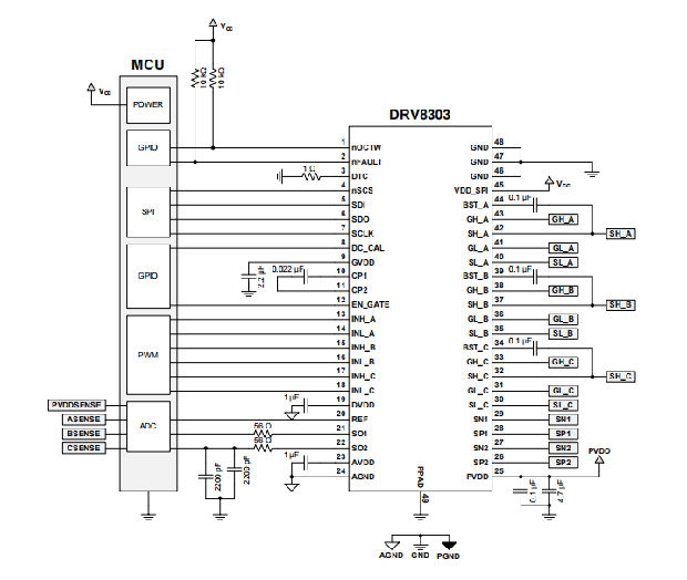 DRV8303为MOSFET功率级提供过流和欠压保护。在故障关闭条件下,所有门驱动器输出将保持低,以确保外部FET处于高阻抗状态。