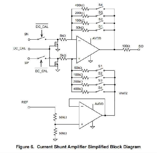 电流分流放大器通过SPI寄存器有4个可编程增益设置。它们是10、20、40和80 V/V。
