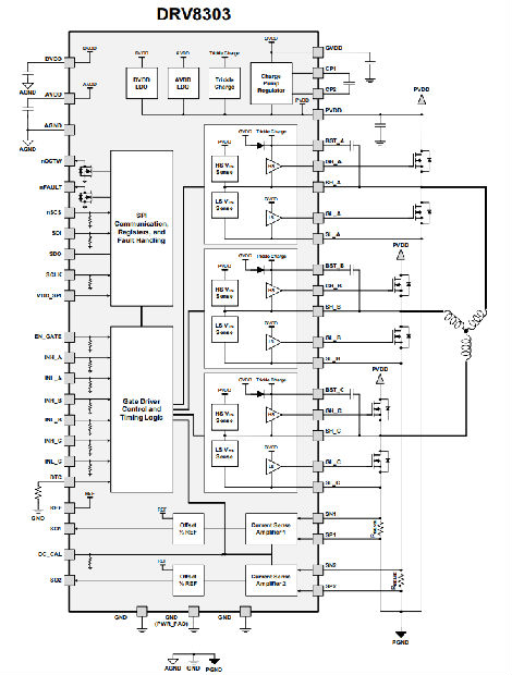 DRV8303是一种栅极驱动器,用于驱动三相无刷直流电机和外部功率MOSFET。该器件提供了三个半桥门驱动器、两个电流分流放大器和过流保护的高集成度。