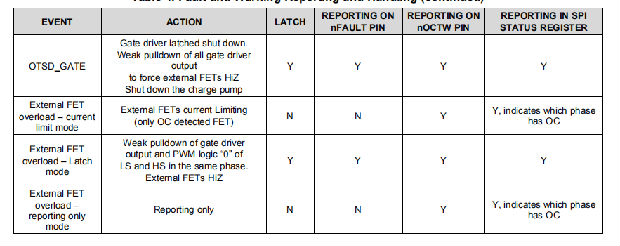 3.仅报告模式:当发生过电流事件时,在此模式下不会采取任何保护措施。过电流事件将通过nOCTW引脚(64μs脉冲)和SPI状态寄存器报告。外部MCU应根据其自身的控制算法采取行动。