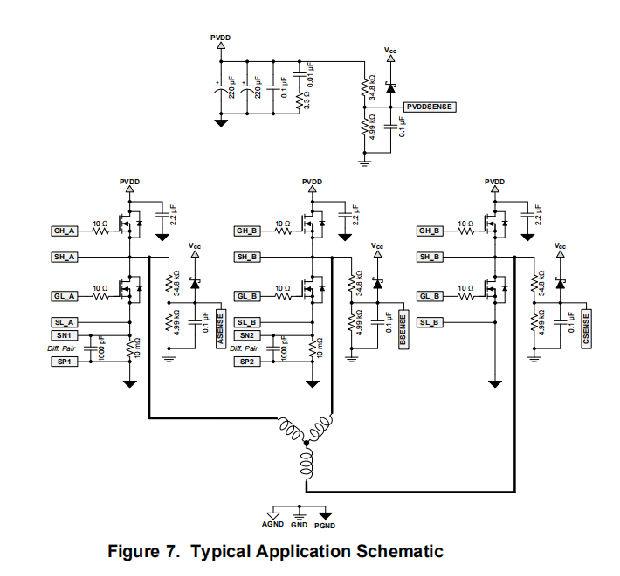 •GVDD旁路电容器应放置在靠近其相应引脚的位置,其低阻抗路径连接至设备GND(电源板)。