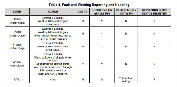 一个例外是重置GVDD_-OV故障。快速门快速故障复位或SPI命令复位在GVDD\U OV故障下不起作用。复位GVDD_OV故障需要一个低电平保持时间超过10μS的完整EN_GATE。TI强烈建议在发生GVDD_OV时检查系统和板。