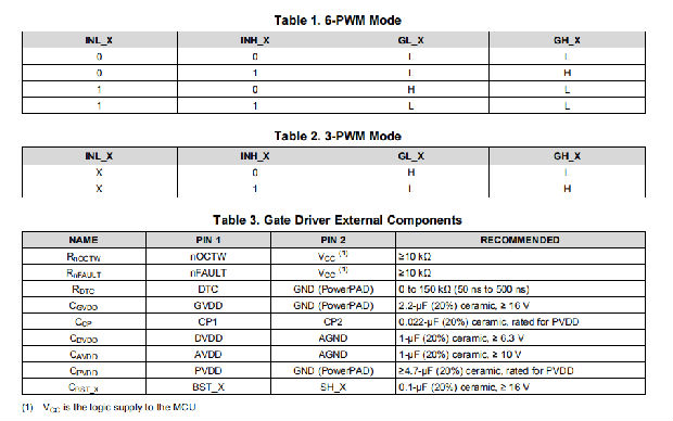 在门极电压大于1的情况下(如果PVDU的电压大于1,则PVDEN驱动可能不正确)。当DRV8301通过EN_GATE启用时,应确保SH_X引脚上的电压水平低于8.5 V,从而避免这种顺序。