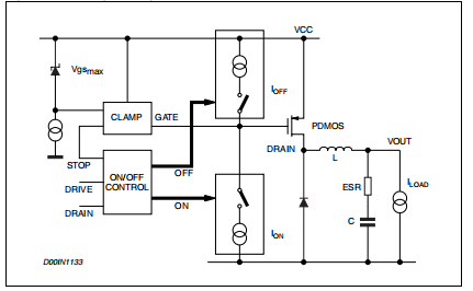 由于板寄生。开启过电流,导致效率和系统可靠性下降。EMI问题大。续流二极管寿命更短。关断期间的电流下降时间也很关键。事实上,它产生电压尖峰(由于电路板的寄生元件)会增加PDMOS。为了减少这些问题,我们采用了一种新的驱动电路拓扑结构其框图如图7所示。其基本思想是改变用于打开和关闭电源开关的电流水平,根据PDMOS状态和门箝位状态。这种电路允许快速关闭和打开电源开关,并管理上述各项与续流二极管恢复时间问题有关的问题。为了避免内部开关的Vgs高于Vgsmax公司。开/关控制块可避免电源线之间的任何交叉传导和地面。