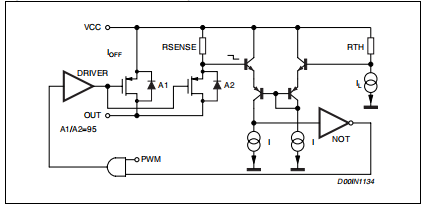 如果温度低于芯片高于固定的内部阈值(150°C)。的传感元件芯片非常接近PDMOS区域,因此确保了准确和快速的温度检测。大约20°C的迟滞可避免设备的开启和关闭连续不断地